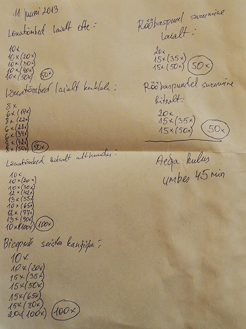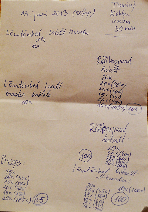 Päev hakkab läbi saama ja kohe lähengi magama enne kui päris ära kustun. Koos päikesetõusuga olin täna varahommikul Võrtsjärvel kalal ja siis veel pikk tööpäev ning trenni ka. Lisanditest läksid täna PUMP+, PUDDING, HERA80, RECOVERY, BCAA ja RUSH. Mis ma siin ikka lobisen väsinud vaimuga. Panen pildi ka üles treeningkavast. Laialt lõuatõmmete jaoks pean veel natuke ehitama- praegune pink ei sobi. Küll vaikselt lisan uusi harjutusi ja väljakutseid.