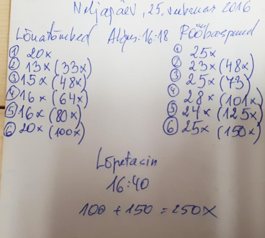 Täna tuli uus 2016 aasta kaalurekord- 81,4 kg ilma igasuguse vaevata. Tõesti ei ole plaaniski kehakaalu niipea -80 kg lasta. Aega on veel kõvasti ja see on kõige olulisem! Tänases trennis tegin erinevad lihasgrupid enne ja selja-tricepsi maratoni trenni lõpus. Nii on loogilisem ja jõuab rohkem!