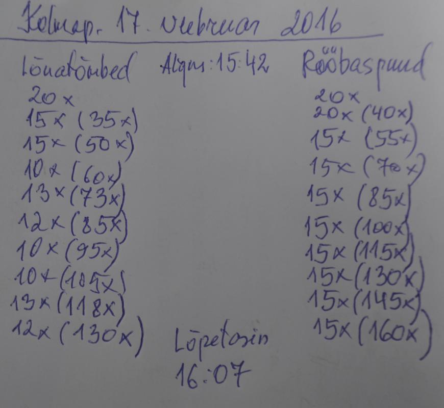 Selles suhtes, et alles nüüd sain arvuti taha. Paari sõnaga siis edusammudest. Täna tõesti tuli uus 2016 kehakaalurekord, mis paranes eelmise nädala parima tulemusega tervelt 400 grammi! Uus rekord siis 82,7 kg, aga ma panin päris korralikult hullu selle eesmärgi nimel. Mis siis ikka- lisan siia mõned pildid ka oma tegemistest ja siis ruttu unele- homme tuleb pikk päev!