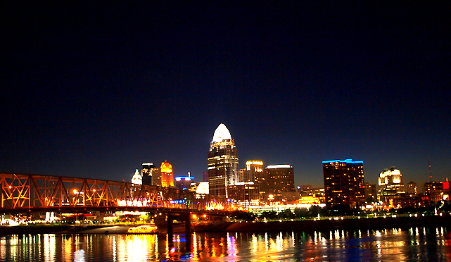 Cincinnati, Ohio, USA. Selles linnas elab umbes 2,1 miljonit inimest. Teisel pool jõge on juba Kentucky osariik mitmete väikeste üksteise kõrval asetsevate linnadega ning hinnanguliselt elab terves piirkonnas umbes 3 miljonit inimest. Selle pildi tegingi Kentucky osariigi poole pealt.