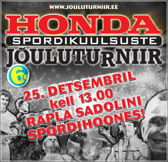 MemberSellel aastal toimub Honda Jõuluturniir Rapla uues Spordihoones. Mõõtu võtavad nagu ka varasematel aastatel Eesti parimad tippsportlased erinevatelt spordialadelt. Ise olen seekord õhtujuhi rollis koos Ott Järvelaga ja kulturiste esindab meie esijuunior Mikk Raudsepp. Lisaks Mikule astuvad võistlustulle: Erki Nool, Nikolai Novosjolov, Andres Raja, Allar Raja, Mart Poom, Tanel Leok, Egon Kaur, Ainar Karlson, Priit Ailt, Johannes Ahun, Kaarel Nurmasalu.
