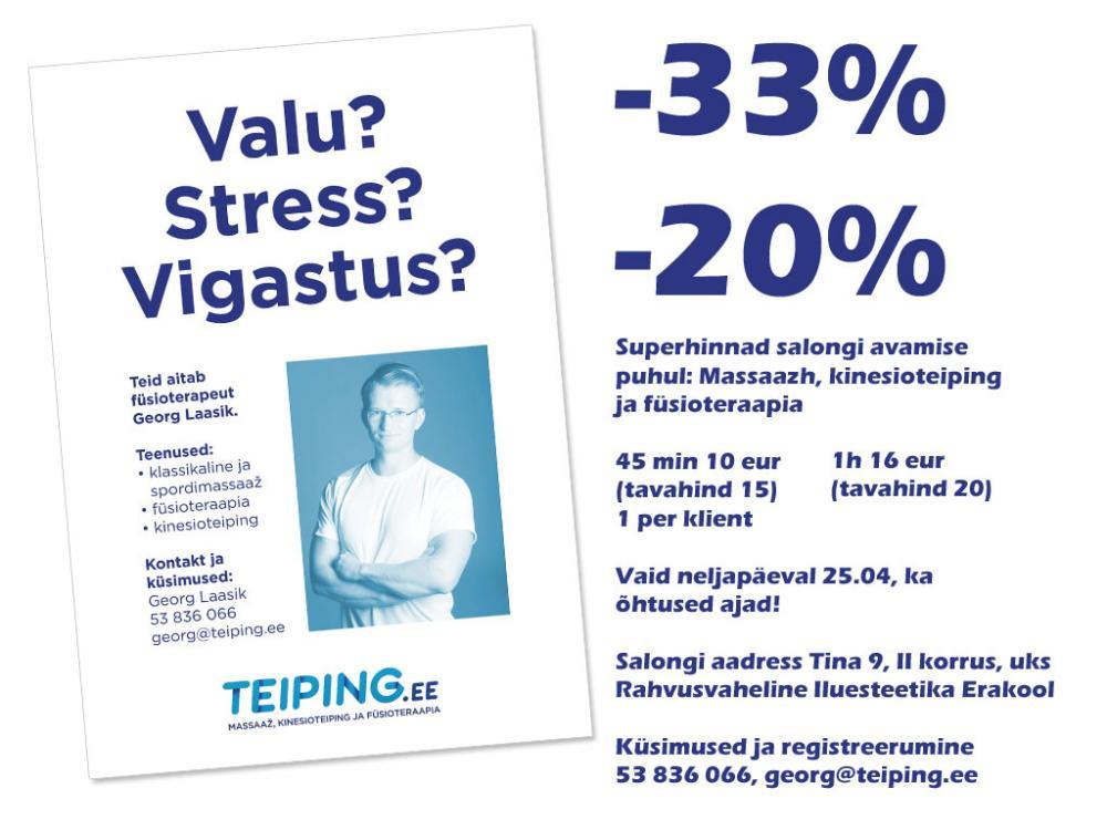 Neljapäeval, 25.04 on kõigil võimalus tulla soodushinnaga massaaži v füsioteraapiasse/kinesioteipingule minu uude kabinetti aadressil Tina 9, Tallinn, ja uurida, miks sportlastele minu massaaž nii meeldib.