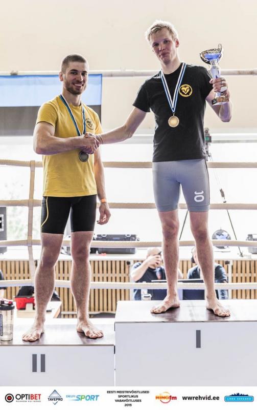 Nimelt siis, võistlesin mina teisel päeval, kohe finaalis, kus minu vastane oli hea sõber ja põhiline treeningpartner ALAR HUTROV. Meie matš oli ülimalt tasavägine, kuid minul õnnestus lahkuda ringist võitjana ja esimese Eesti meistrina kehakaalus -65,8kg. On au olla esimene Eesti meister vabavõitluses!