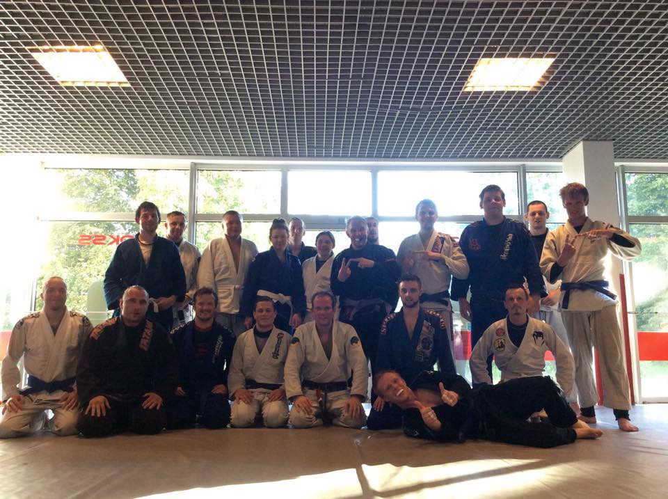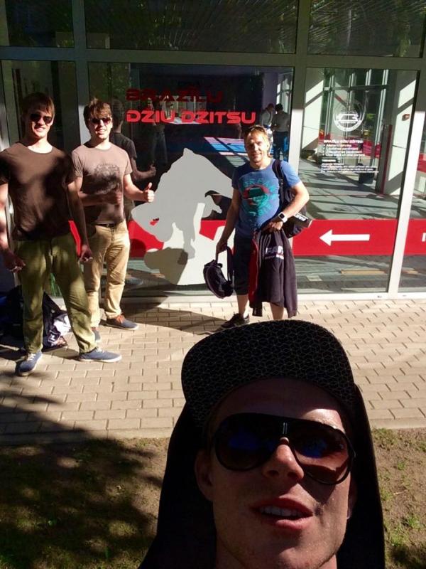 Järsku tekkis saalis elu ja kolisime sinna. Teine trenn oli Gi-ga. Teises trennis olid juba osad näod tuttavad. Kahjuks polnud ühte tüüpi, keda kõik peale esimest trenni kiitsid, kuid kes oli minust mööda veerenud. Pole hullu, tema asemel oli üks purple belt, kellega oli väga põnev rullida. Trenn nägi samamoodi välja nagu eelmine. Kõigepealt rivistus, siis asendipõhine äktsioon ja lõpus vastuvõtt. Trenn oli väga palav. Ma võin öelda, et jätsin Lätti suure kausitäie higi. Palavust võis võrrelda keskmise spordiklubi saunaga. Ei tundu hull? Mõtle, kui sul oleks laval kaasas paks pidžaama ja keegi sind selle sisse mässida üritaks, samal ajal sinu kõri pitsitades. See selleks, palju ma ikka virisen. Trenn oli tore ja väga põnev oli uute inimestega rullida. Nad teevad asju ikkagi teistmoodi kui meie ja oma tehnika kohandamine vastavalt erinevatele stiilidele avabki „jitsisilma“. Ühispilt ka lõppu!